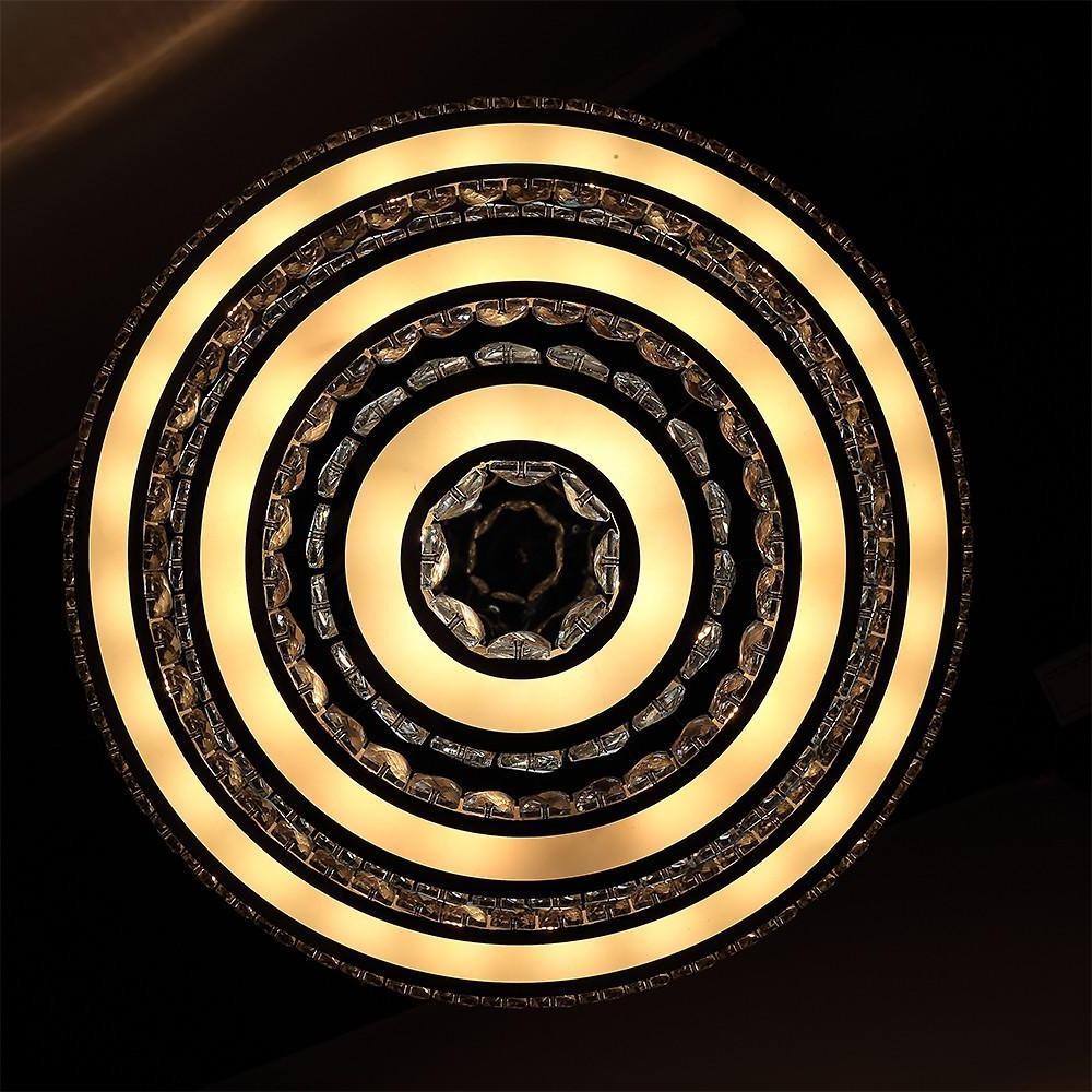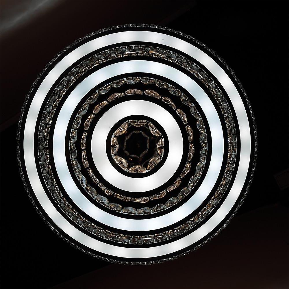 Each circle is detailed and richly textured with what feel like many small, smooth facets or bumps, which are actually crystals that catch and play with light. The structure of the Metal LED Modern Chandeliers is metallic, with a sleek, chrome finish. The light is suspended from the ceiling by multiple thin, almost invisible wires, contributing to a floating appearance.