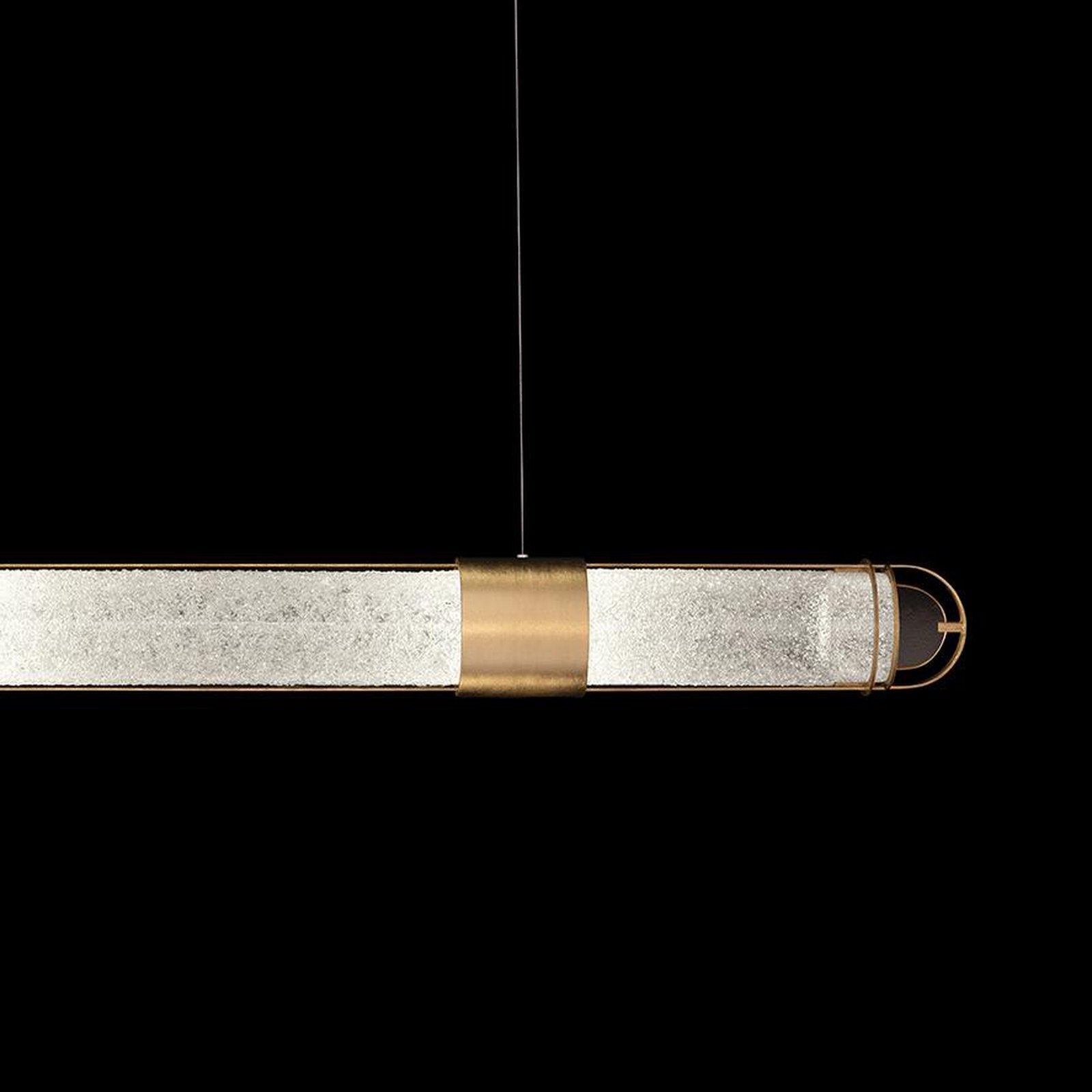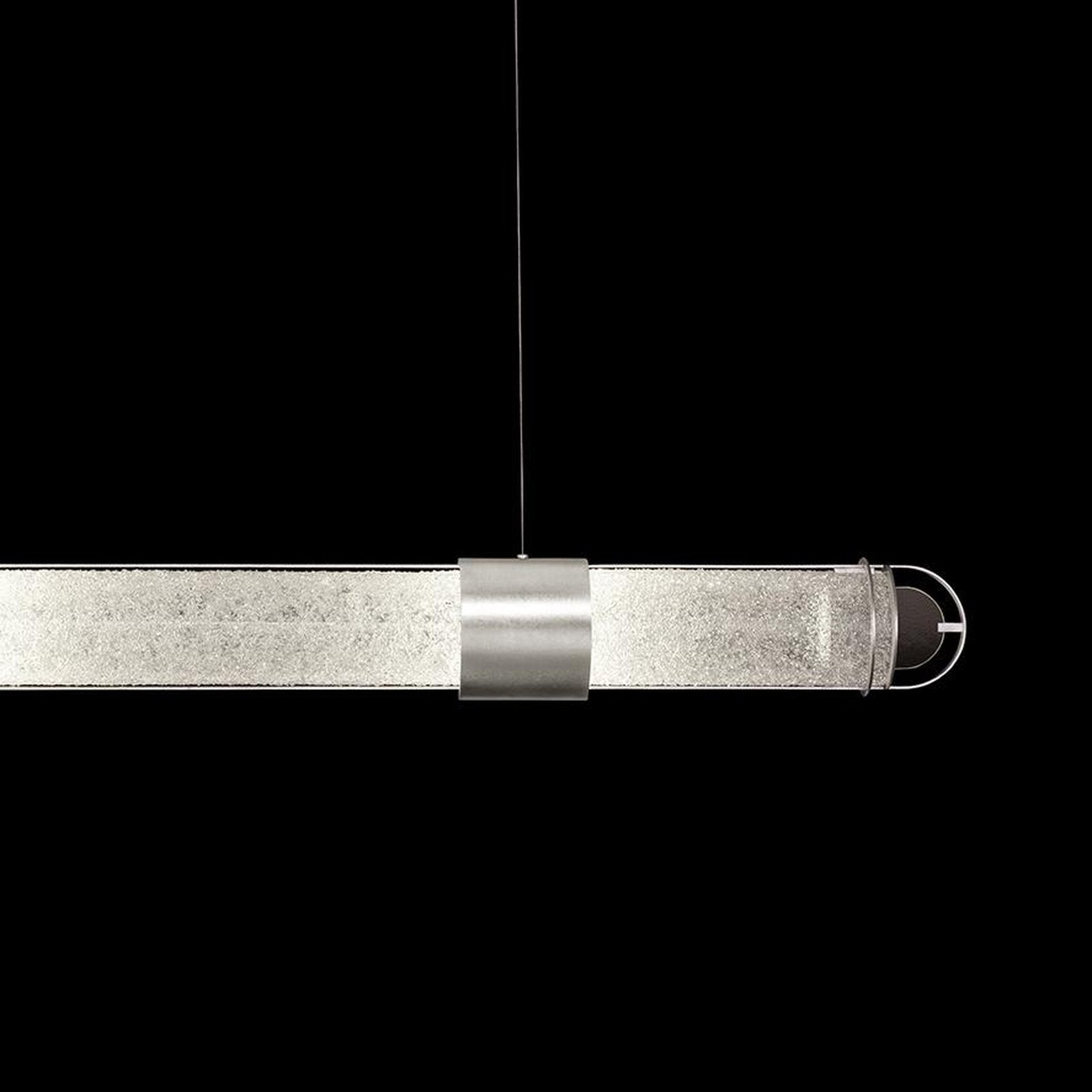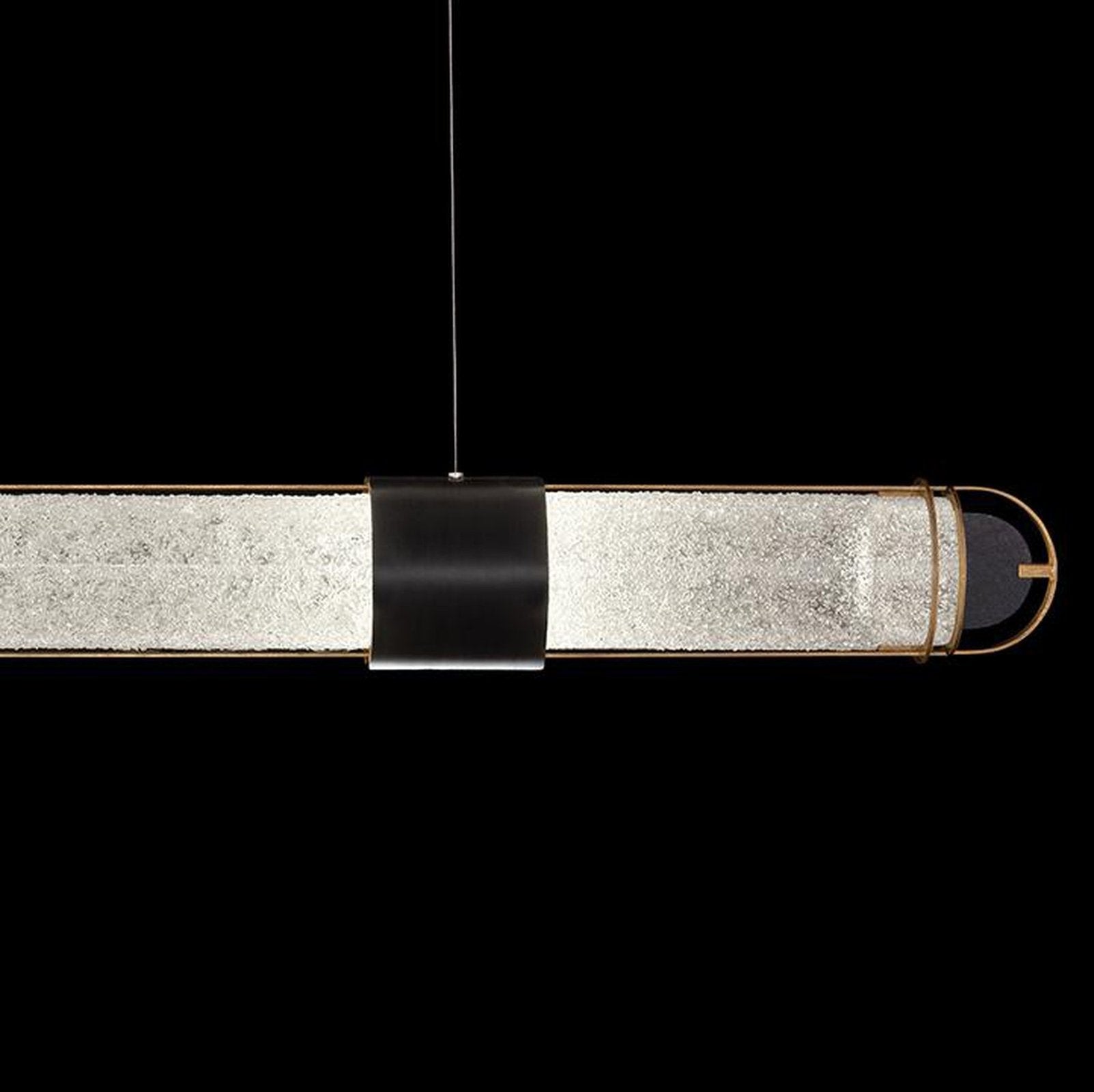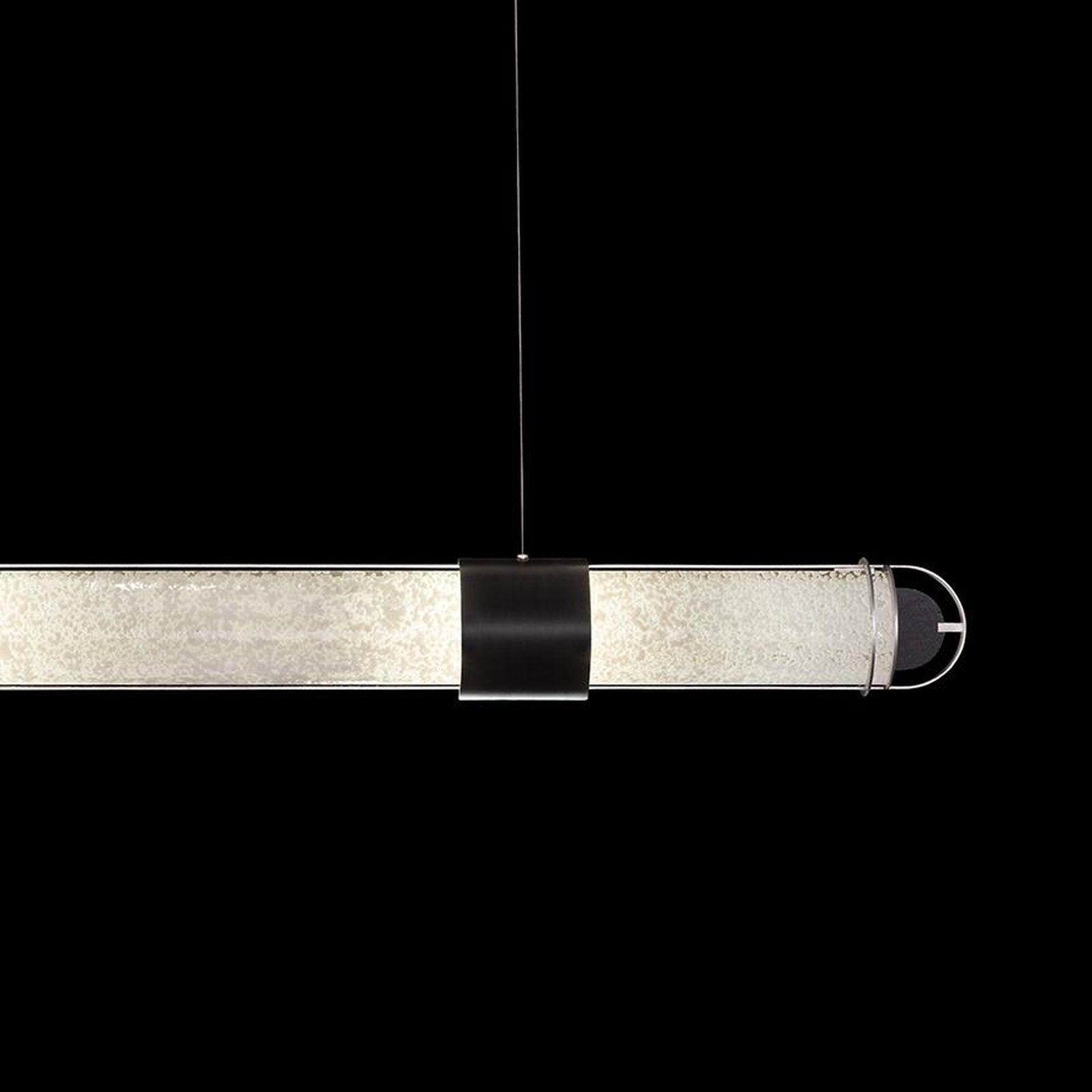 - LED pendant featuring illuminated cylinders formed by handcrafted glass set within a silhouette, beautifully lit from within, spanning space vertically or horizontally.