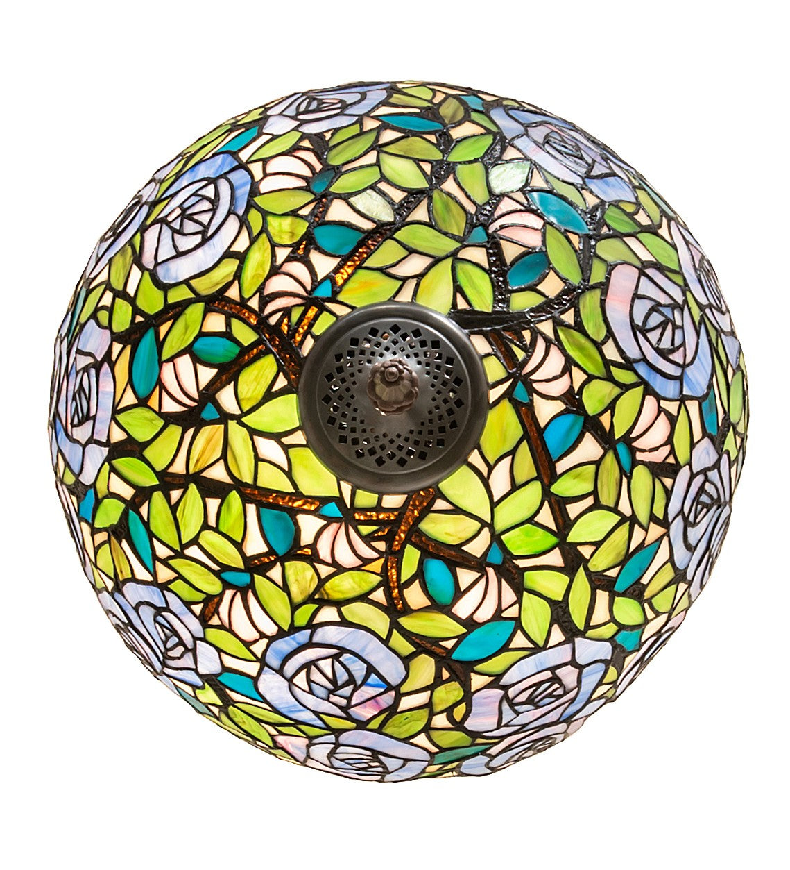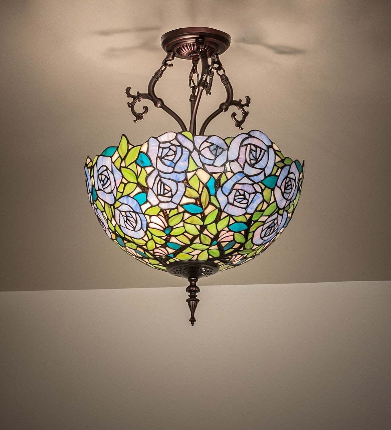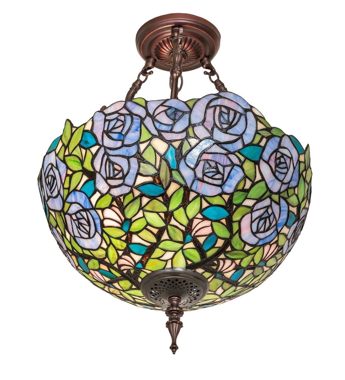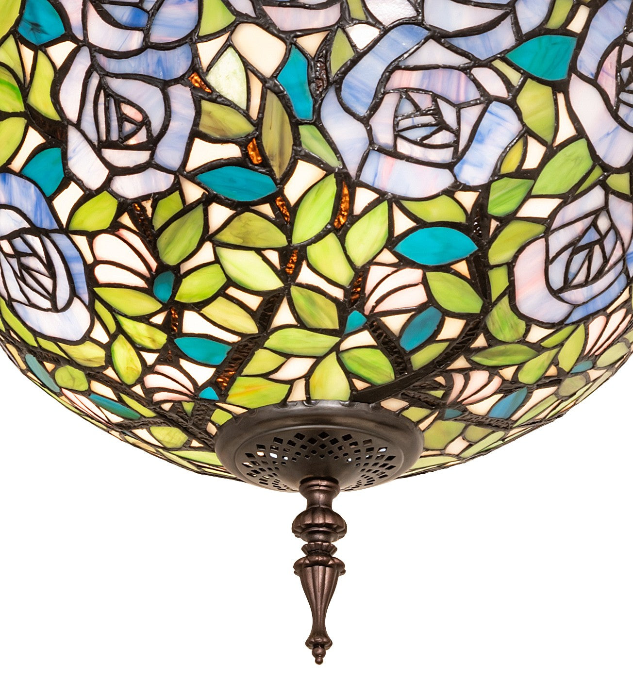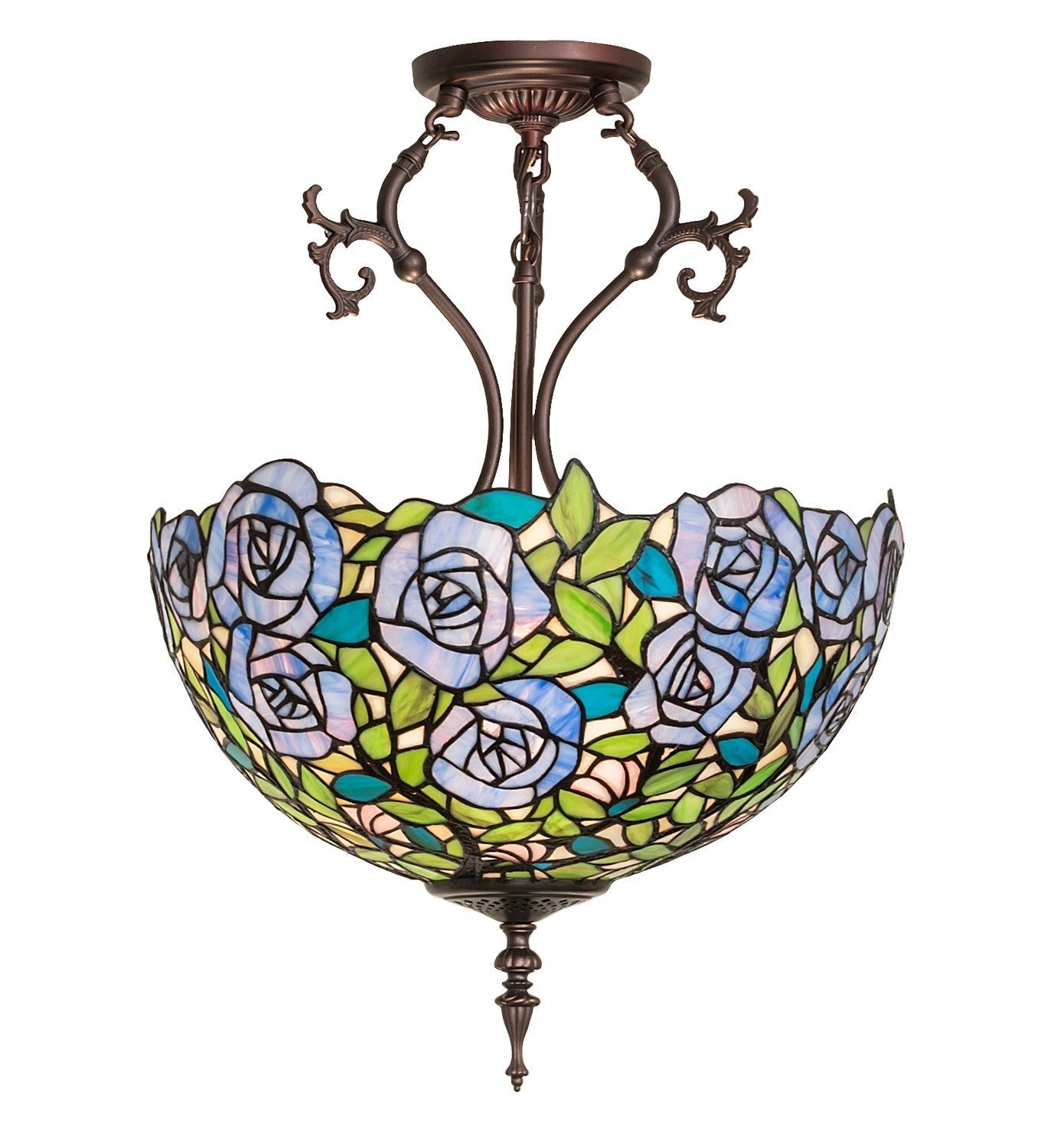 One of the most beloved of all floral beauties. The Rosebush is beautifully represented in this stunning lighting shade design that features beautiful Blue-streaked Lavender Art Glass Roses rambling on a maze of Garden Green leaves with Bark Brown branches. This gorgeous shade is created using the famous Meyda Tiffany copperfoil construction. The delicate stained glass shade is embraced by elegant metal hardware featured in Mahogany Bronze. This design is inspired by the lovely Rose Gardens from Brooklyn, New York, to Pasadena, California. The Rosebush Inverted Semi-Flushmount is included in our American-designed, handcrafted Tiffany Reproduction Collection. Each shade is a unique work of art with color variations based on natural ingredients inherent in the glass.