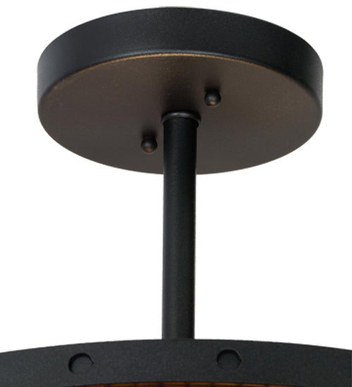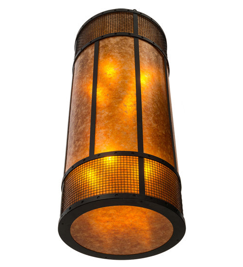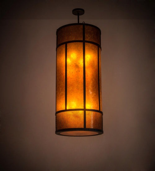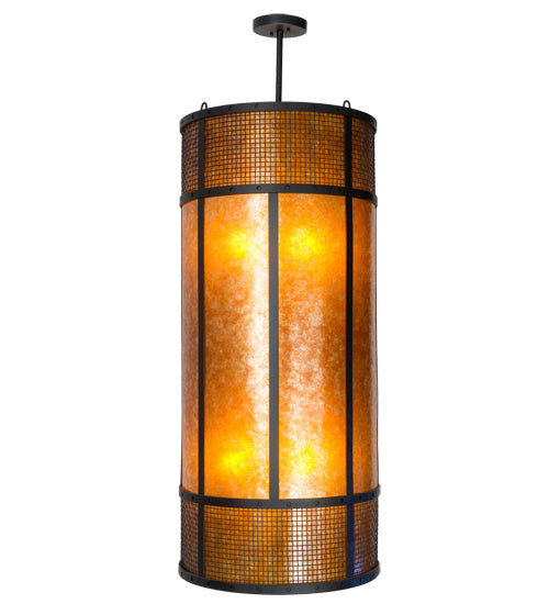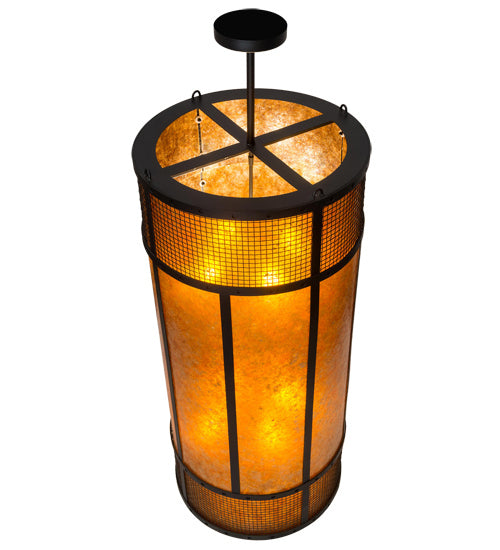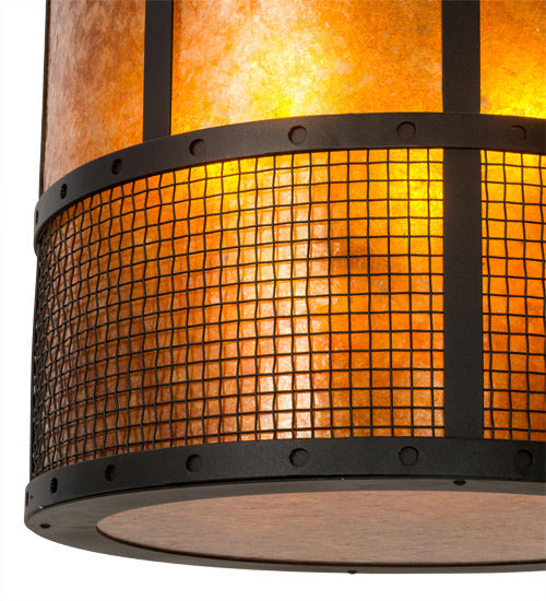 Emancipate your design freedom with this stunning cylindrical Amber Mica shade enveloped with a metal frame featuring mesh wraps top and bottom. The shade is enhanced with a complementary bottom diffuser. The metal hardware and grill are featured in a stunning Textured Black finish and includes loops to secure customer supplied anti-sway chains that accommodate windy conditions. Handcrafted by highly skilled artisans in the USA, this brilliant fixture is offered in a myriad of custom lamping options, as well as sizes, designs and finishes. The 22-inch wide pendant is UL and cUL listed for damp and dry locations.