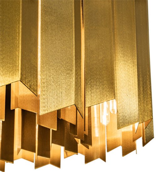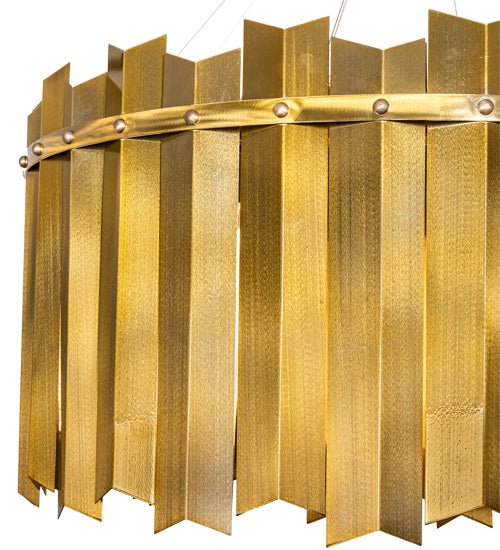 Rich and inviting. Designed like a ring of chiseled Bars of Gold. The Eldorado Pendant blends an elegant style with a breathtaking look… This massive fixture is custom-crafted with 64 Transparent Gold finished slat-styled elements surrounding a Contrail Mist Idalight diffuser. Overall height ranges from 30 to 95 inches as the aircraft cable easily adjusts in the field. The fixture is ideal for illuminating dining tables, lobbies, entryways, and other residential, hospitality, and commercial spaces. The Eldorado Pendant is included in our American-designed, handcrafted Contemporary Lighting Collection. UL and cUL listed for dry and damp locations.